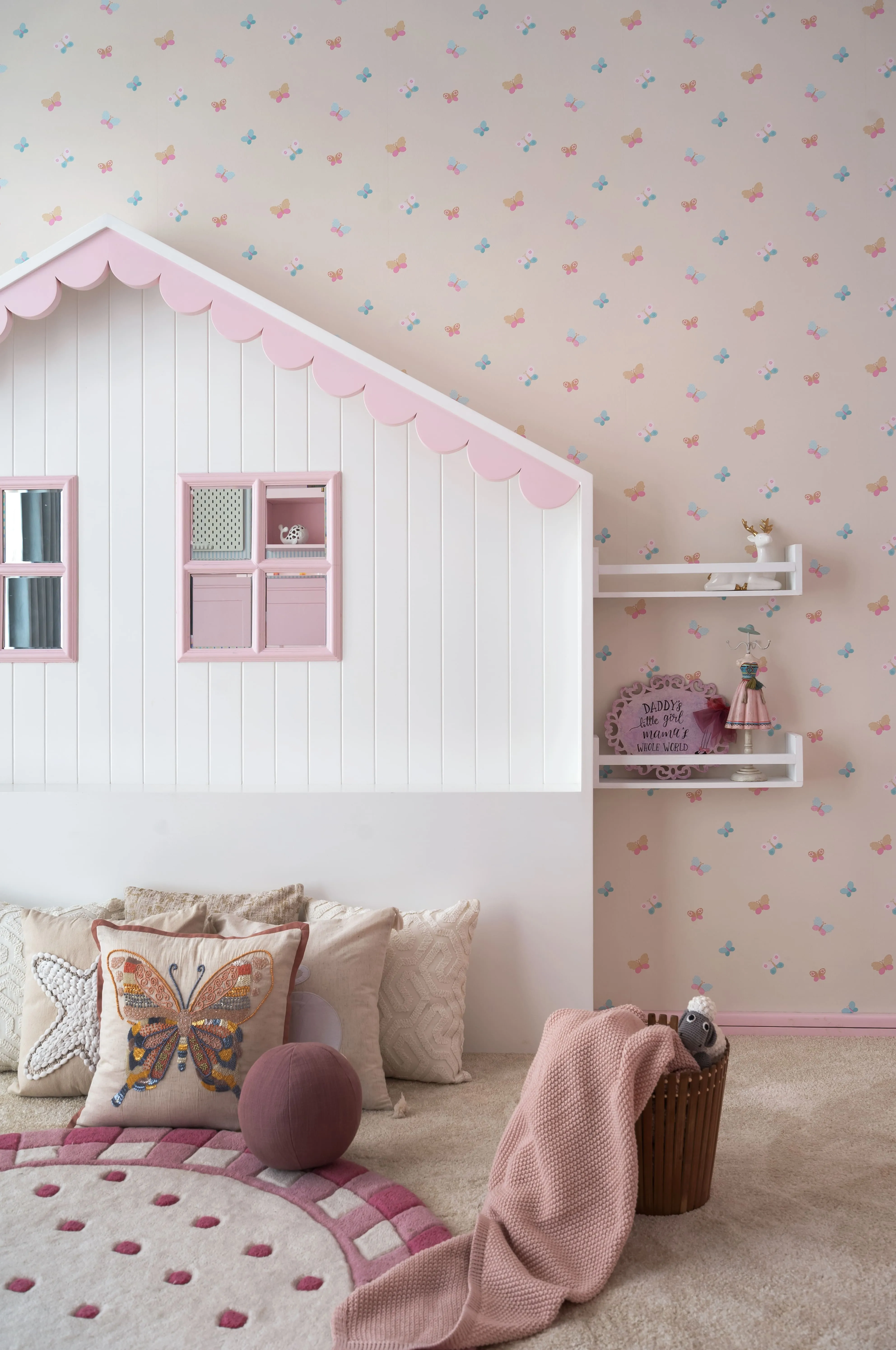 Each bedroom carries its own narrative. The master suite embraces a refined palette of blush, beige, and muted taupe. A second bedroom brings freshness and character through mint-green cabinetry and woven cane, transforming storage into an aesthetic feature. The children’s rooms celebrate individuality and playfulness: the boy’s room pulses with sporty energy and football-inspired details, while the girl’s room unfolds like a soft, whimsical dream in baby pink and white, tender and fairy-like.
